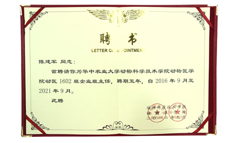 上成生物總經(jīng)理陳建軍同志被華中農(nóng)業(yè)大學(xué)動(dòng)物科學(xué)技術(shù)學(xué)院動(dòng)物醫(yī)學(xué)院聘請為1602班企業(yè)班主任,聘期五年。