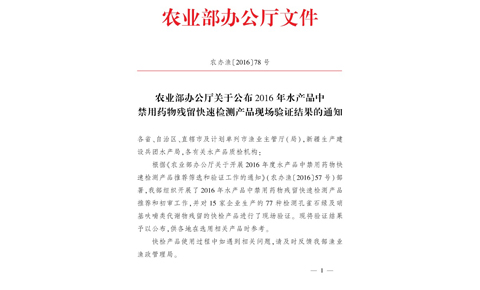 根據(jù)《農(nóng)業(yè)部辦公廳關(guān)于開展2016年度水產(chǎn)品中禁用藥物快速檢測產(chǎn)品推薦篩選和驗(yàn)證工作的通知》(農(nóng)辦漁〔2016〕57號(hào))部署,農(nóng)業(yè)部組織開展了2016年水產(chǎn)品中禁用藥物殘留快速檢測產(chǎn)品推薦和初審工作,上成生物送檢產(chǎn)品全部通過現(xiàn)場驗(yàn)證。