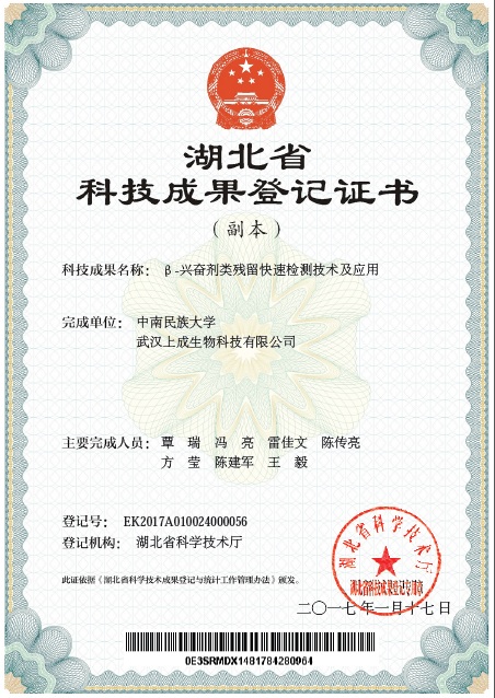 2016年9月27日,武漢上成生物科技有限公司研究成果“動(dòng)物源性食品中硝基呋喃類藥物殘留快速檢測技術(shù)”通過國家科技部科研技術(shù)成果評價(jià)。