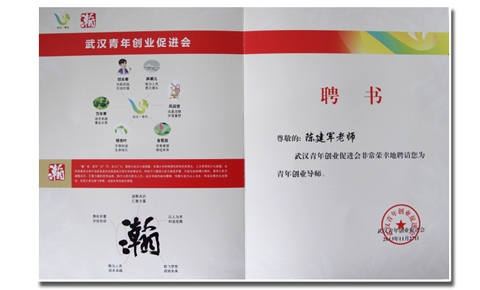2013年武漢青年創(chuàng)業(yè)促進會聘請陳建軍為“青年創(chuàng)業(yè)導師”。
