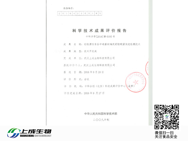 2016年9月27日,武漢上成生物科技有限公司研究成果“動(dòng)物源性食品中硝基呋喃類藥物殘留快速檢測(cè)技術(shù)”通過國(guó)家科技部科研技術(shù)成果評(píng)價(jià)。