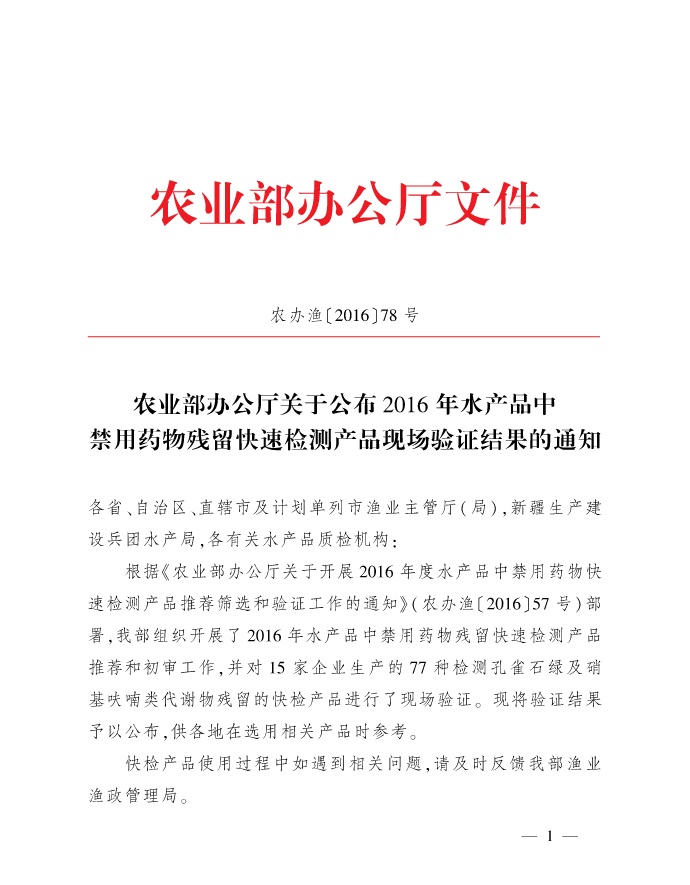 根據(jù)《農(nóng)業(yè)部辦公廳關(guān)于開展2016年度水產(chǎn)品中禁用藥物快速檢測產(chǎn)品推薦篩選和驗(yàn)證工作的通知》(農(nóng)辦漁〔2016〕57號)部署,農(nóng)業(yè)部組織開展了2016年水產(chǎn)品中禁用藥物殘留快速檢測產(chǎn)品推薦和初審工作,并對15家企業(yè)生產(chǎn)的77種檢測孔雀石綠及硝基呋喃類代謝物殘留的快檢產(chǎn)品進(jìn)行了現(xiàn)場驗(yàn)證。