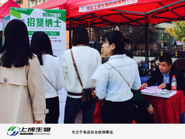為響應(yīng)武漢市第十三次黨代會精神,大力實施“百萬大學(xué)生留漢創(chuàng)業(yè)就業(yè)計劃”,武漢上成生物積極參與武漢市政府在華中科技大學(xué)、華中農(nóng)業(yè)大學(xué)和中南財經(jīng)政法大學(xué)的校園招聘會。我們?yōu)樵谛4髮W(xué)生提供了多個見習(xí)和正式崗位,待遇豐厚、福利保障全面(“五險一金”+年假+年度體檢+年度旅游+進修學(xué)習(xí))。招聘現(xiàn)場氣氛熱烈,武漢上成生物與在校學(xué)生面對面洽談,了解學(xué)生對企業(yè)的要求,同時也篩選合適公司戰(zhàn)略發(fā)展的優(yōu)秀人才。