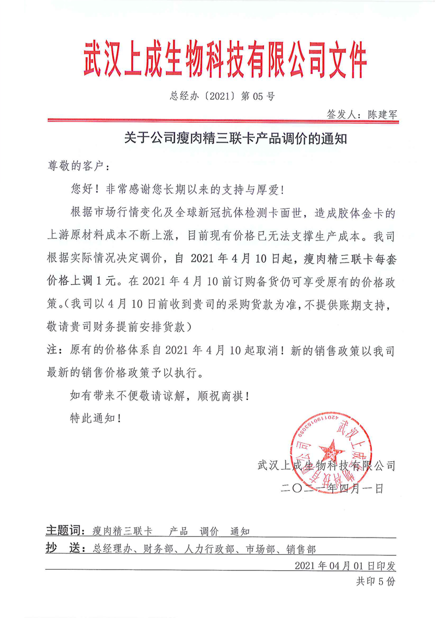 關(guān)于公司瘦肉精三聯(lián)卡產(chǎn)品調(diào)價(jià)的通知函